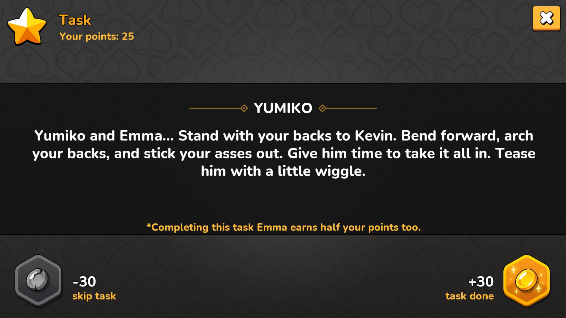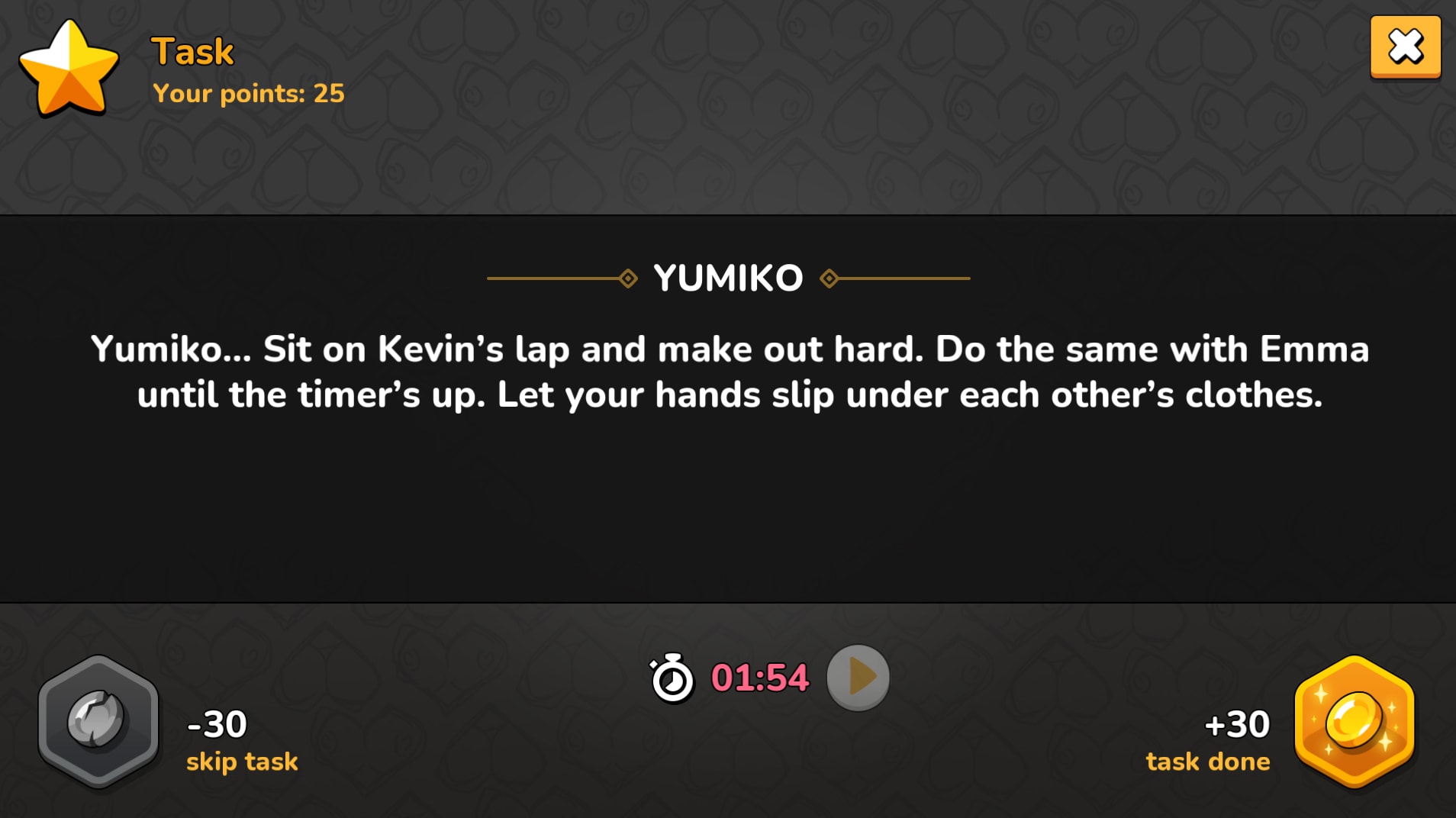 It’s simple: draw a task, dive in, and let the game take control. Things might start innocently enough, think teasing kisses or cheeky questions that get everyone laughing. But don’t be fooled, this game knows how to escalate. Before you know it, you’ll be venturing into steamy territory, acting out your wildest fantasies with a grin.